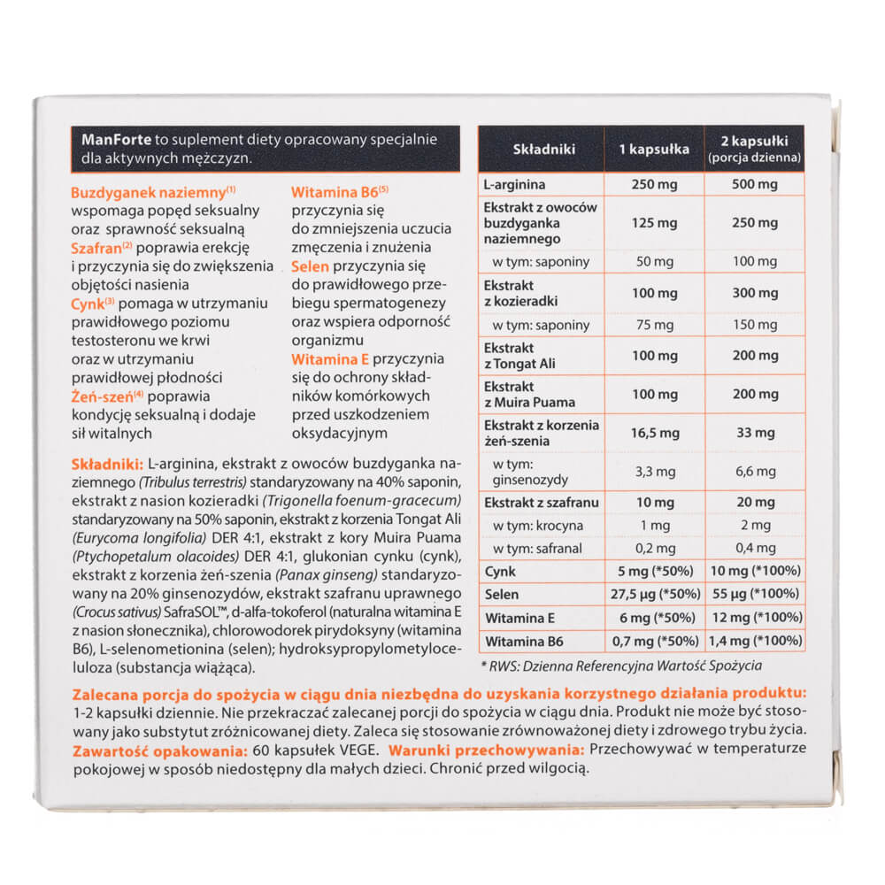 Das Nahrungsergänzungsmittel ManForte enthält einen hohen Anteil an L-Arginin, Muskatblütenextrakt, der das sexuelle Verlangen und die Leistungsfähigkeit unterstützt, sowie Ginsengextrakt, der zu optimaler Ausdauer, Vitalität und körperlichem und geistigem Wohlbefinden beiträgt. Die neue ManForte-Formel ist außerdem mit Bockshornklee- und Safranextrakt angereichert, die die Erektion verbessern und zu einem erhöhten Spermavolumen beitragen.
