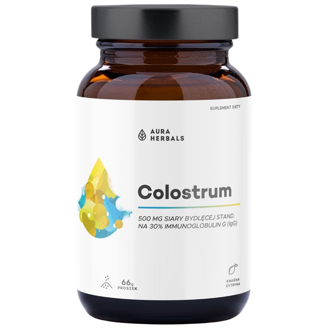 Aura Herbals Kolostrum 500 mg ist ein pulverförmiges Nahrungsergänzungsmittel mit säuerlichem Zitronengeschmack, das gefriergetrocknetes Rinderkolostrum enthält. Eine Portion (1,1 g) liefert 500 mg Kolostrum, standardisiert auf 30 % Immunglobulin G (IgG = 150 mg) . Das Rohmaterial stammt von polnischen Bauernhöfen und wird aus der ersten und zweiten Melkung gewonnen. Packungsinhalt: 66 g = 30–60 Portionen . Enthält Milch.