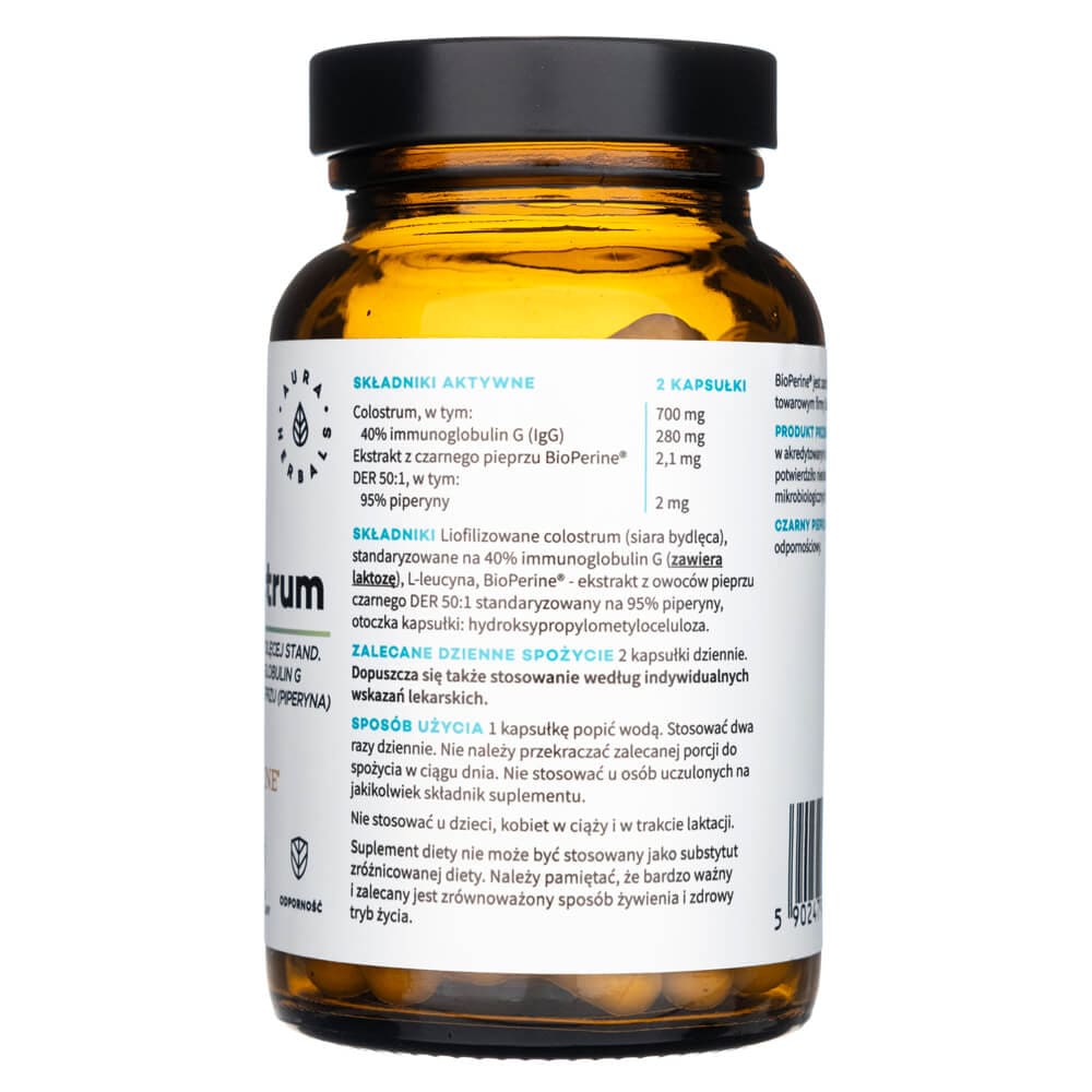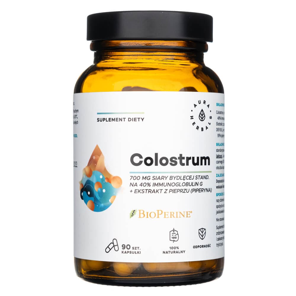 Colostrum ist ein Nahrungsergänzungsmittel in Kapseln von Aura Herbals, das 700 mg Rindercolostrum enthält, das auf 40% Immunglobulin G standardisiert ist, mit dem Zusatz des Markenextrakts BioPerine® aus schwarzem Pfeffer, der auf 95% Piperin standardisiert ist. Der schwarze Pfeffer in der Nahrungsergänzung fördert die Verdauung und die Nährstoffaufnahme und verstärkt die Wirksamkeit der anderen pflanzlichen Inhaltsstoffe.
