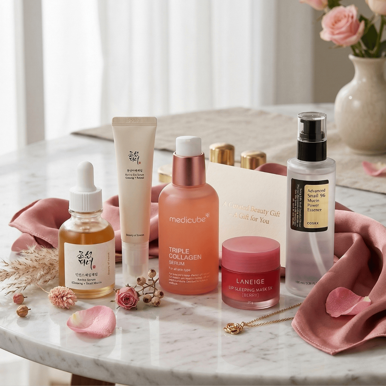 Das K-Beauty Anti-Aging-Geschenkset vereint fünf hochwirksame Hautpflege-Essentials mit Schneckenschleim,, Ginseng,, Meereskollagen und Peptiden – einige der bekanntesten Inhaltsstoffe der koreanischen Schönheitspflege. Dieses sorgfältig zusammengestellte Abendritual wirkt den sichtbaren Zeichen der Hautalterung entgegen und verleiht reifer Haut neue Festigkeit, Ausstrahlung und intensive Feuchtigkeit.