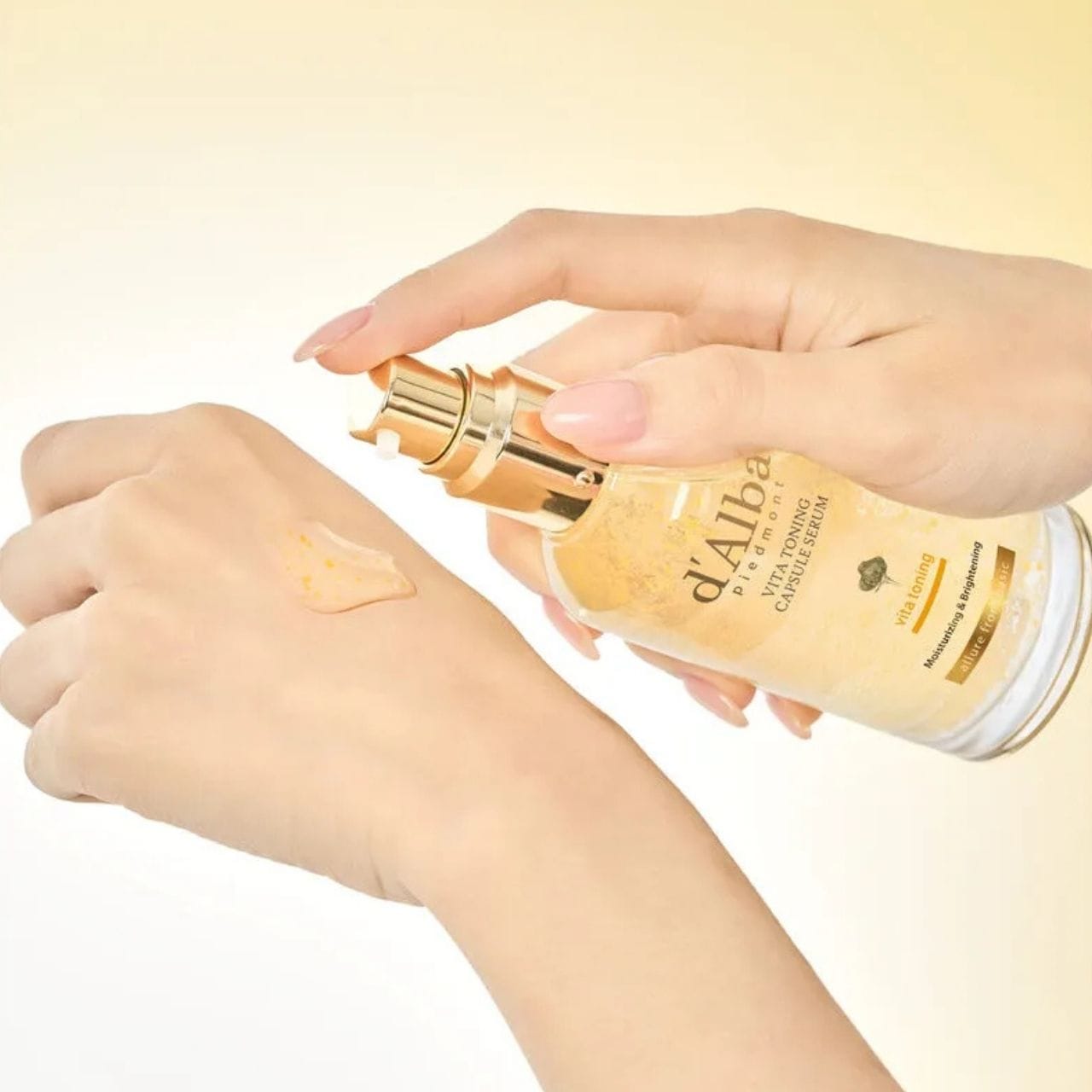 Serum D'Alba Vita Toning – eine bahnbrechende Formel auf Basis von reinem Sanddornwasser , die der Haut natürliche Vitaminenergie spendet. Die einzigartigen 40.000 Vitaminkapseln, die beim Auftragen freigesetzt werden, pflegen die Haut intensiv und sorgen für einen sofortigen Aufhellungseffekt. Der fortschrittliche Vitality Complex vereint feuchtigkeitsspendende, regenerierende und Anti-Aging-Wirkstoffe, die synergistisch von innen heraus wirken.