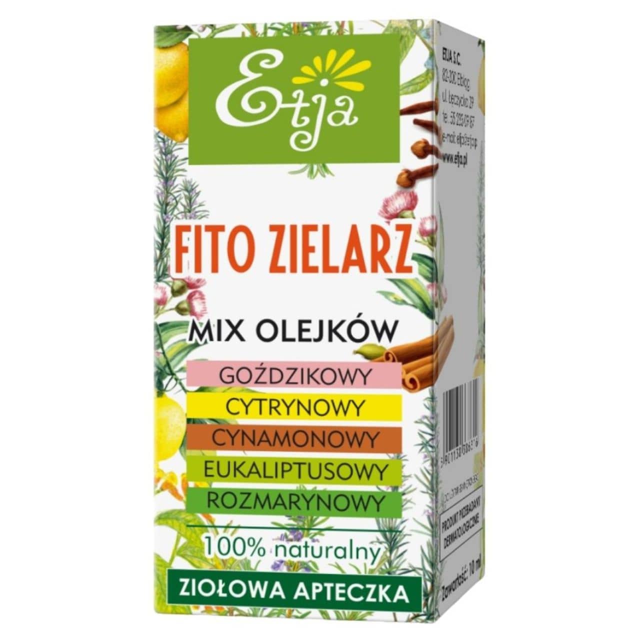 Fito Zielarz Öl ist eine professionelle Mischung aus 5 natürlichen ätherischen Ölen : Zitrone, Zimt, Eukalyptus, Nelke und Rosmarin. Es wirkt wärmend und erfrischend mit einem intensiven, würzig-zitronigen Aroma. Es stärkt das Immunsystem, lindert Atemwegsinfektionen und rheumatische Schmerzen. 100 % natürlich , zertifizierte Formel!