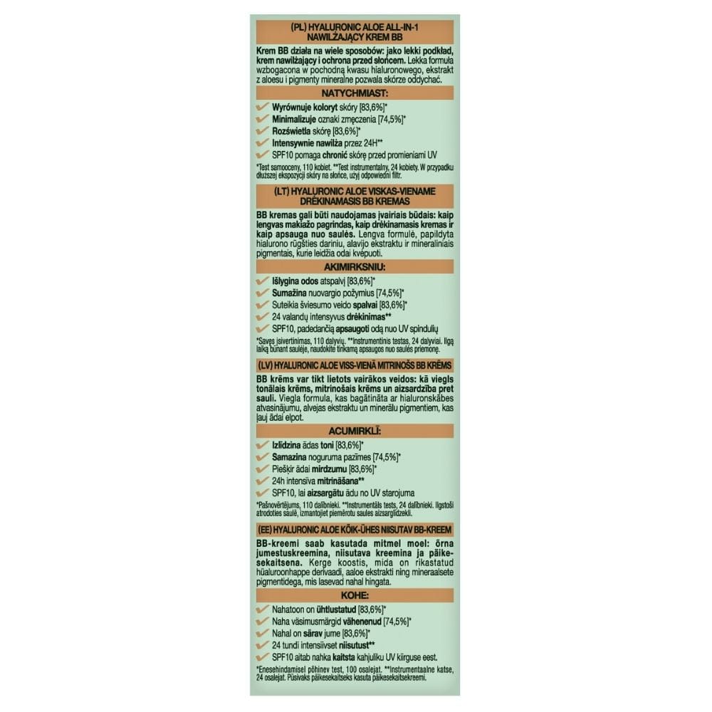 Garnier BB Cream ist ein multifunktionales Produkt, das die Eigenschaften einer leichten Grundierung, einer Feuchtigkeitscreme und eines Sonnenschutzes vereint. Ihre leichte Formel, angereichert mit einem Hyaluronsäurederivat, Aloe Vera-Extrakt und mineralischen Pigmenten, lässt die Haut atmen und ist für alle Hauttypen geeignet. Die BB Cream gleicht den Hautton sofort aus, minimiert Anzeichen von Müdigkeit, hellt den Teint auf und spendet 24 Stunden lang intensive Feuchtigkeit, während sie gleichzeitig LSF 10-Schutz bietet .