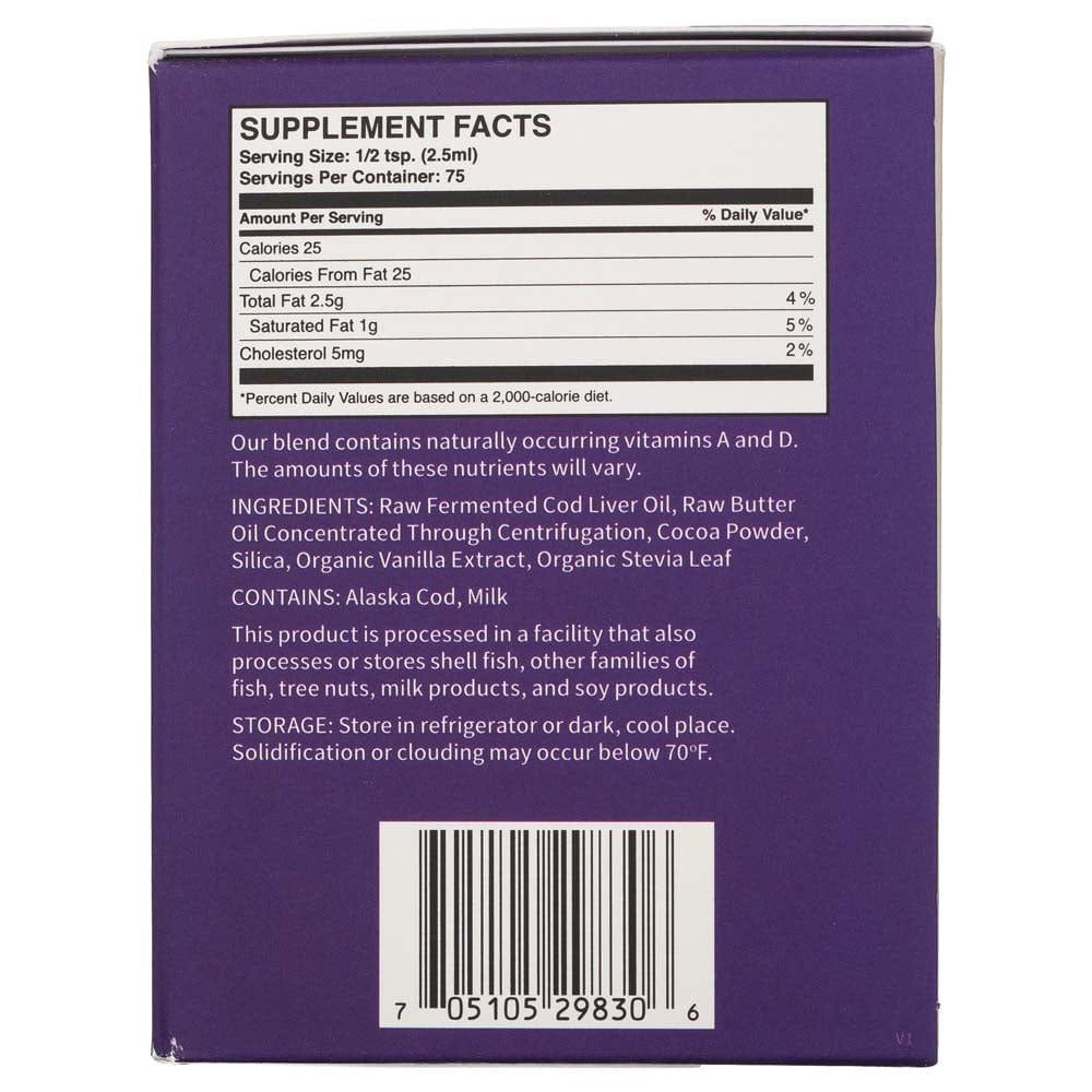 RAW Fermentiertes Kabeljauleberöl, RAW Durch Zentrifugation konzentriertes Butteröl, Kakaopulver, Organischer Vanilleextrakt, Silica, Organische Steviablätter.