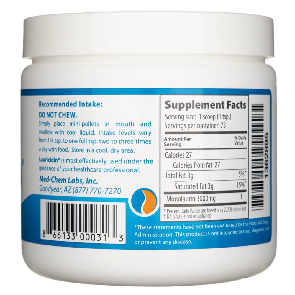 Lauricidin von Med-Chem Labs ist ein Nahrungsergänzungsmittel, das reines Monolaurin (C-12 sn1 Monoglyceride) aus Kokosnussöl enthält. Das gleiche Monolaurin wird aus Muttermilch, Sägepalme und Bittermelone gewonnen. Lauricidin® ist ein Konzentrat von Laurinsäure ((3) -Monolaurin) in Form von Minigranulat (~30mg pro Granulat).