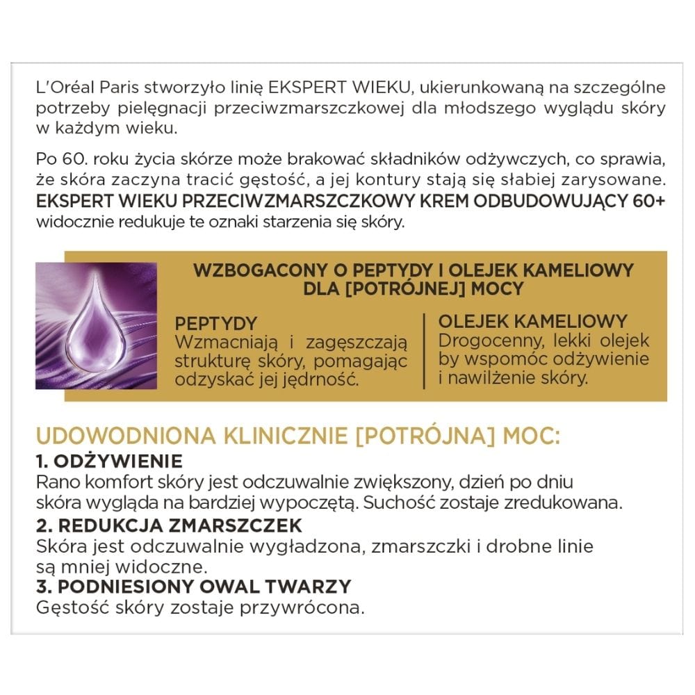Die regenerierende Anti-Falten-Nachtcreme 60+ Age Expert ist ein innovatives Produkt, das von L'Oréal Paris als Teil einer Linie entwickelt wurde, die auf die spezifischen Bedürfnisse der Anti-Falten-Pflege ausgerichtet ist. Es ist eine Antwort auf die Herausforderungen reifer Haut nach dem 60. Lebensjahr, wenn die Haut unter Nährstoffmangel leiden kann, was zu einem Verlust an Dichte und schwächeren Gesichtskonturen führt.