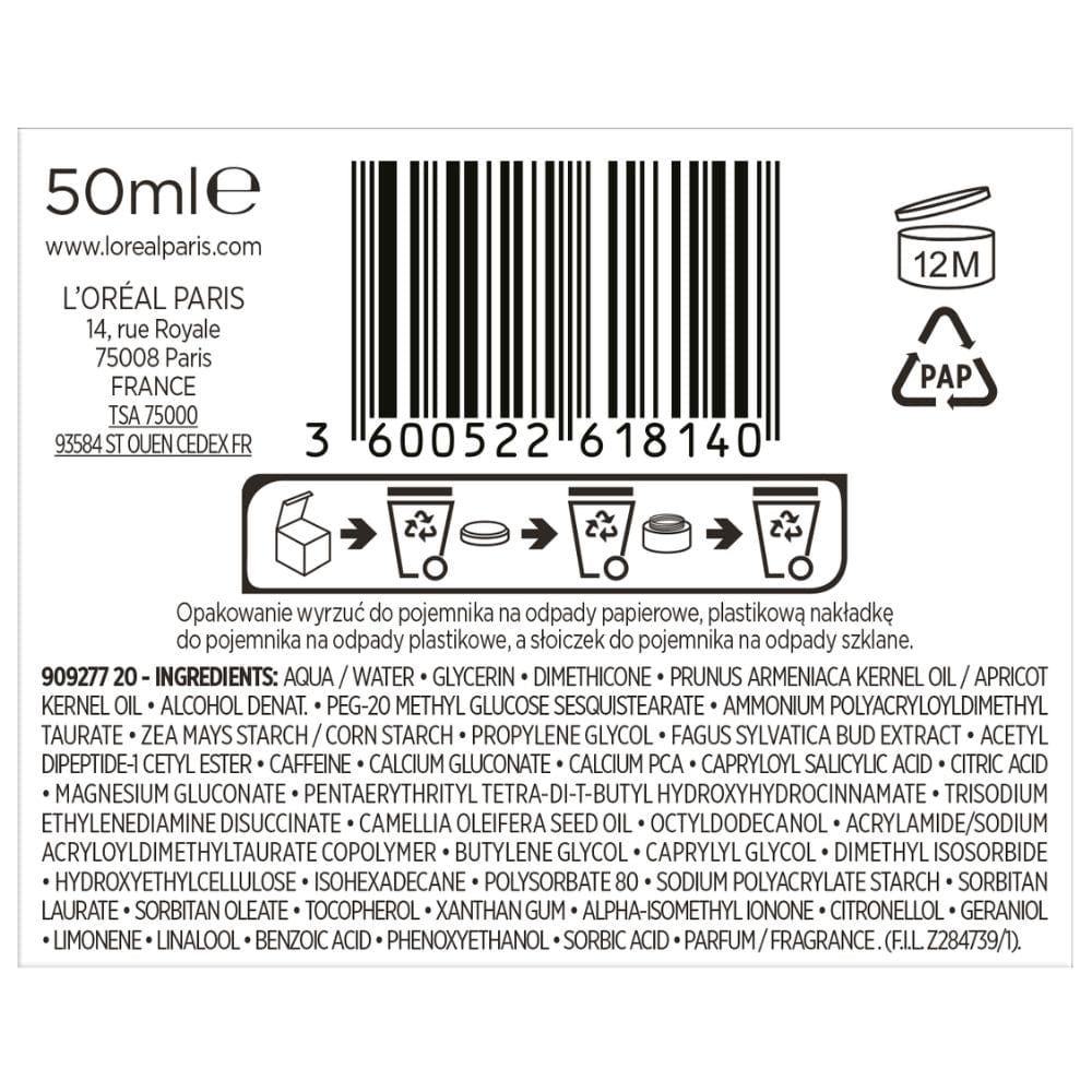 Aqua, Wasser, Glycerin, Dimethicon, Prunus Armeniaca Kernel Oil, Apricot Kernel Oil, Alcohol Denat, PEG-20 Methyl Glucose Sesquistearate, Ammonium Polyacryloyldimethyl Taurate, Zea Mays Stärke, Maisstärke, Propylenglykol, Fagus Sylvatica Knospenextrakt, Acetyl Dipeptide-1 Cetyl Ester, Koffein, Calcium Gluconat, Calcium PCA, Capryloyl Salicylsäure, Zitronensäure, Magnesium Gluconat, Pentaerythrityl Tetra-di-t-butyl Hydroxyhydrocinnamate, Trisodium Ethylenediamine Disuccinate, Camellia Oleifera Seed Oil, Octyldodecanol, Acrylamid, Sodium Acryloyldimethyltaurate Copolymer, Butylenglykol, Caprylylglykol, Dimethyl Isosorbid, Hydroxyethylcellulose, Isohexadecan, Polysorbat 80, Natriumpolyacrylatstärke, Sorbitan Laurat, Sorbitanoleat, Tocopherol, Xanthangummi, Alpha-Isomethylionon, Citronellol, Geraniol, Limonen, Linalool, Benzoesäure, Phenoxyethanol, Sorbinsäure, Parfüm, Duftstoff.