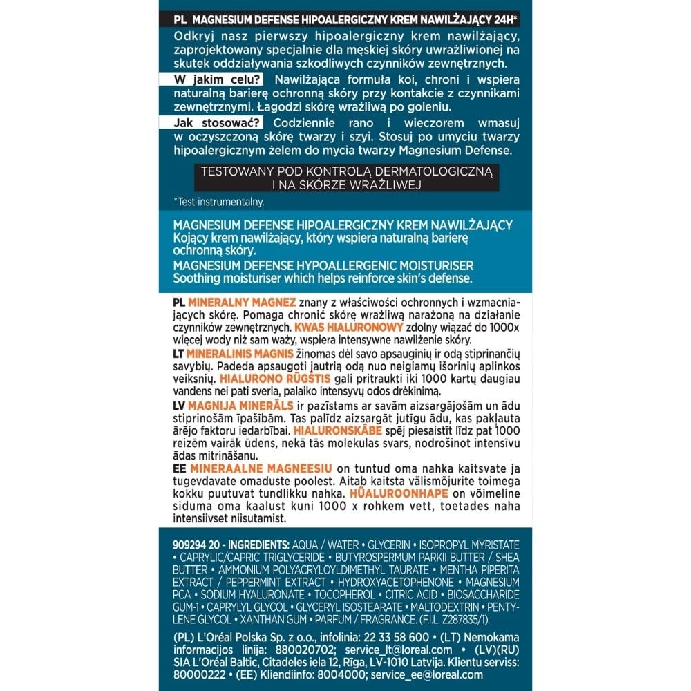 L'Oréal Paris Men Expert Magnesium Defense Hypoallergenic Moisturising Cream ist eine intensiv feuchtigkeitsspendende Creme, die speziell für Männer mit empfindlicher Haut entwickelt wurde. Dank ihres Magnesium- und Hyaluronsäuregehalts beruhigt die Creme die Haut, spendet ihr Feuchtigkeit und stärkt die natürliche Barriere der Haut, um sie vor Verschmutzung und Reizungen zu schützen, insbesondere nach der Rasur.