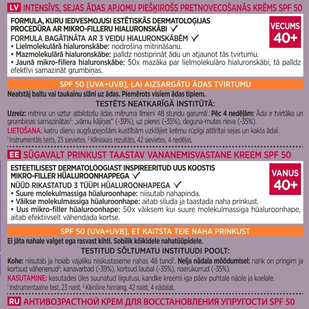 L'Oréal Paris Revitalift Filler SPF 50 ist eine fortschrittliche Anti-Aging-Creme, die von der ästhetischen Dermatologie inspiriert wurde. Sie kombiniert drei Arten von Hyaluronsäure mit hohem Sonnenschutzfaktor 50, bekämpft wirksam die Zeichen der Hautalterung und schützt die Haut vor lichtbedingter Hautalterung.