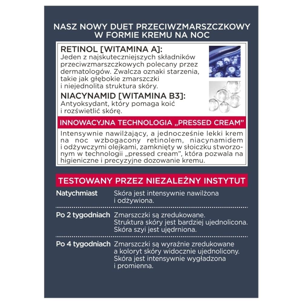 Die L'Oréal Paris Revitalift Laser Retinol- und Niacinamid-Nachtcreme ist ein innovatives Produkt für eine umfassende Anti-Aging-Pflege. Die fortschrittliche Formel kombiniert die Kraft zweier wichtiger Wirkstoffe, Retinol und Niacinamid, um die Zeichen der Hautalterung wirksam zu bekämpfen.