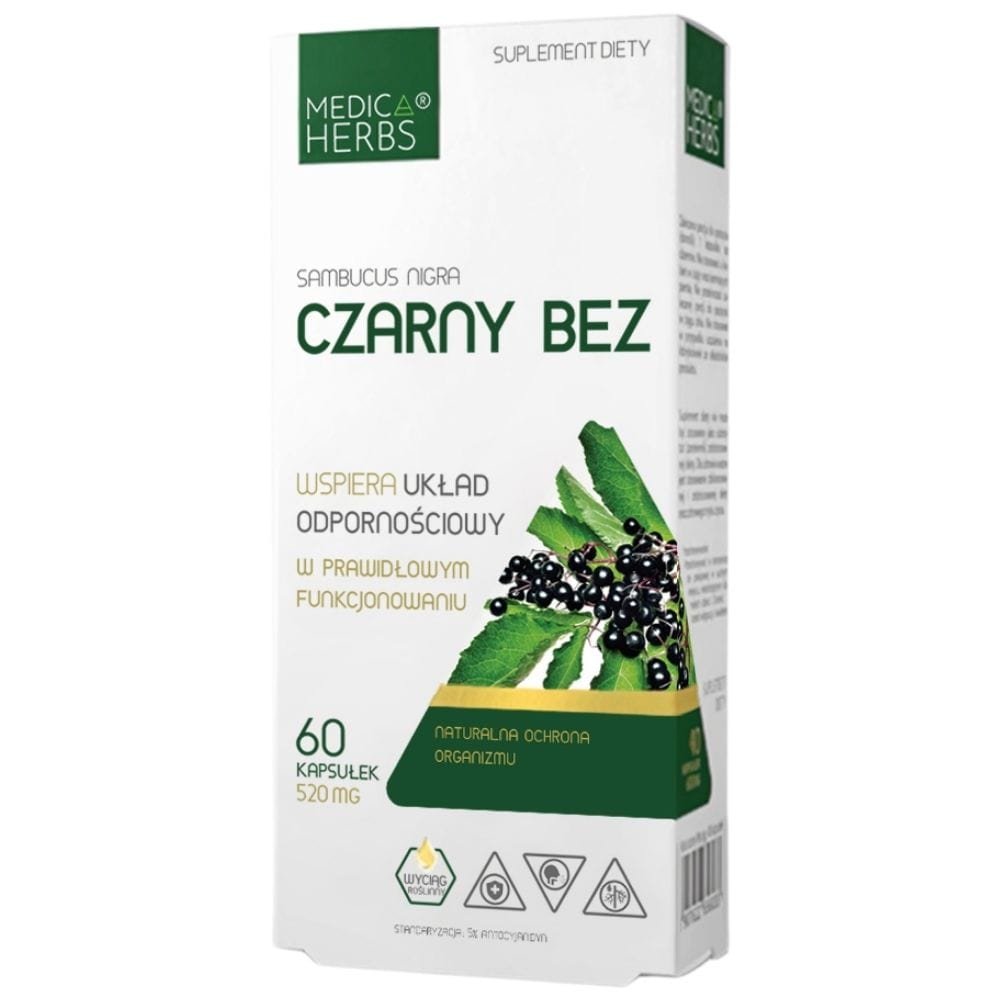 Medica Herbs Schwarzer Holunder ist ein Nahrungsergänzungsmittel in Kapselform. Es enthält Sambucus nigra-Fruchtextrakt , standardisiert auf 5 % Anthocyanidine. Es enthält 520 mg Extrakt, davon 26 mg Anthocyanidine.
