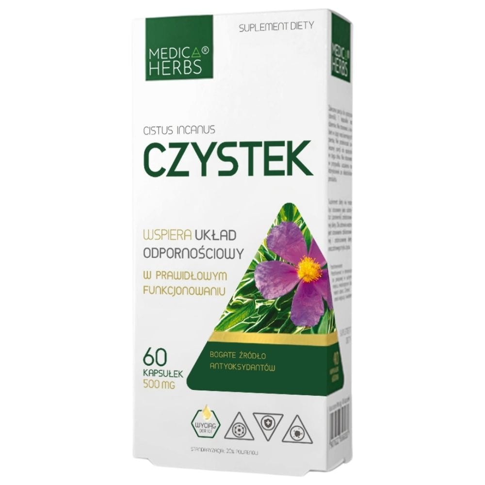 Ein Nahrungsergänzungsmittel in Kapseln von Medica Herbs. Das Produkt enthält 500 mg Zistrosenextrakt (Cistus incanus), standardisiert auf 20 % Polyphenole . Das Produkt enthält keine künstlichen Zusatzstoffe wie Konservierungsmittel, Farbstoffe, Aromen oder Füllstoffe.