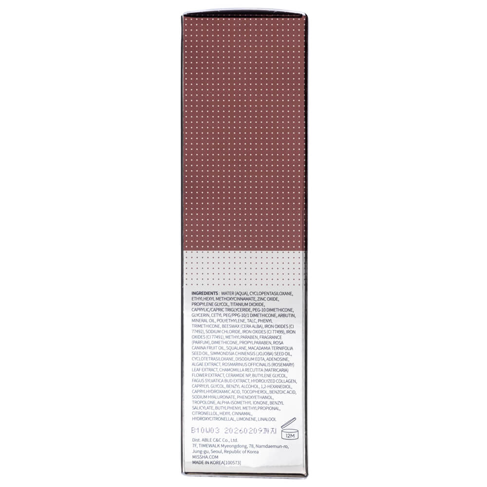 Wasser (Aqua), Cyclopentasiloxan, Ethylhexylmethoxycinnamat, Zinkoxid, Propylenglykol, Titandioxid, Capryl-/Caprinsäuretriglycerid, PEG-10-Dimethicon, Glycerin, Arbutin, Cetyl PEG/PPG-10/1-Dimethicon, Mineralöl, Polyethylen, Talk, Bienenwachs (Cera Alba), Phenyltrimethicon, Eisenoxide (CI 77492), Natriumchlorid, Eisenoxide (CI 77491), Eisenoxide (CI 77499), Duftstoff, Methylparaben, Dimethicon, Macadamia Ternifolia-Samenöl, Propylparaben, Rosa Canina-Fruchtöl , Simmondsia Chinensis (Jojoba)-Samenöl, Squalan, Dinatrium-EDTA, Adenosin, Butylenglykol, Ceramid NP, Fagus Sylvatica-Knospenextrakt, hydrolysiertes Kollagen, Chamomilla Recutita (Matricaria)-Blütenextrakt, Hizikia Fusiforme-Extrakt, Laminaria Japonica-Extrakt, Rosmarinus Officinalis (Rosmarin). ) Blattextrakt, Caprylylglycol, Benzylalkohol, 1,2-Hexandiol, Caprylhydroxamsäure, Natriumhyaluronat, Phenoxyethanol, Benzoesäure, Tropolon, Alpha-Isomethylionon, Benzylsalicylat, Citronellol, Limonen, Hexylzimt, Hydroxycitronellal, Linalool.