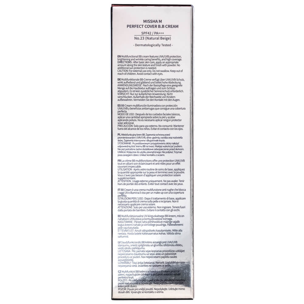 Die multifunktionale BB-Creme deckt effektiv Unvollkommenheiten ab, sorgt für eine glatte und strahlende Haut und behält gleichzeitig ein natürliches Aussehen bei. Missha M Perfect Cover BB Cream schützt auch vor UV-Strahlen – LSF 42 PA + + +, ohne dass andere Sonnenschutzmittel erforderlich sind.