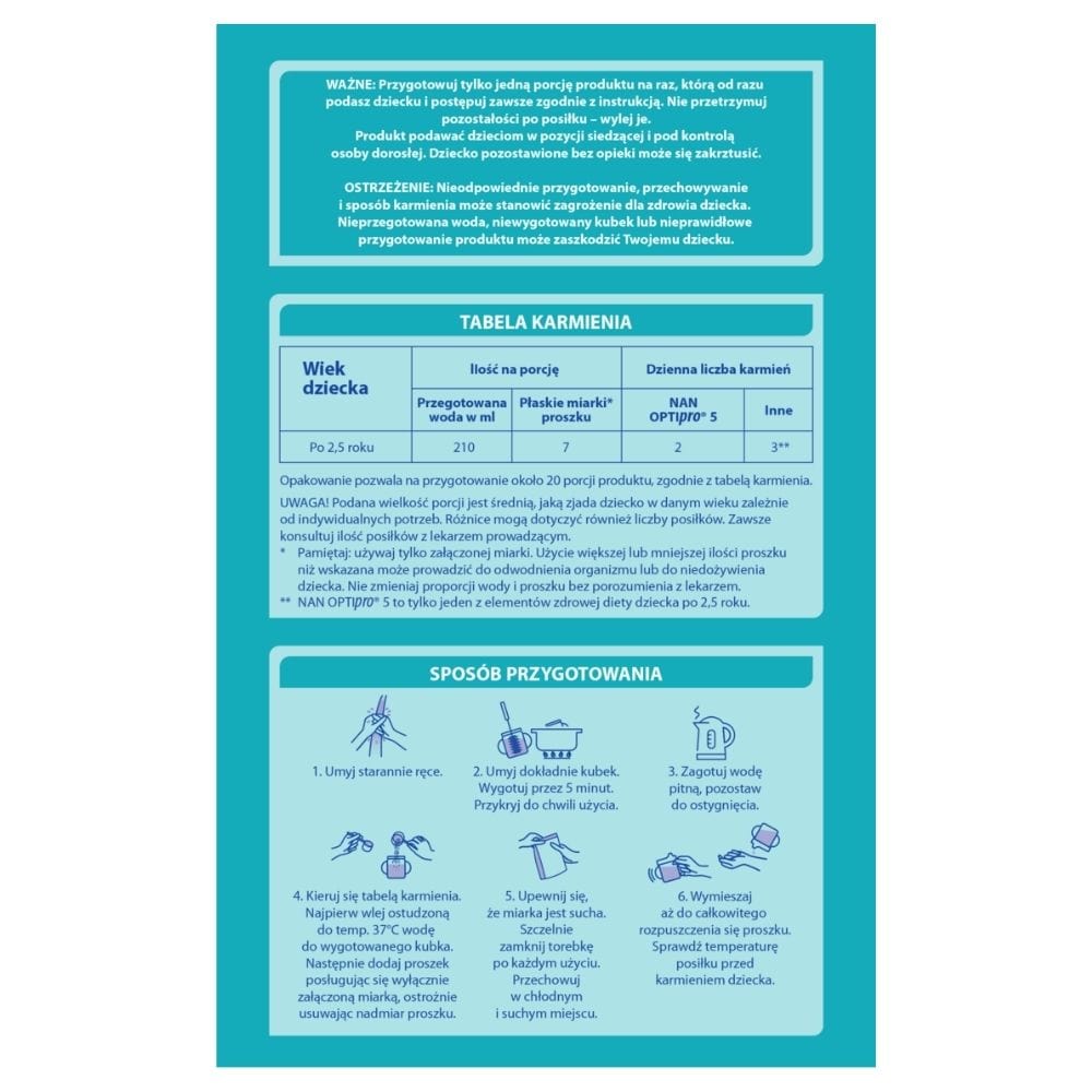 Nestlé NAN OPTIpro 5 ist ein Milchprodukt für Kleinkinder ab 2,5 Jahren. Angereichert mit Vitaminen und Mineralstoffen. Es ist kein Ersatz für Muttermilch, sondern ein Produkt, das die richtige Zusammenstellung der Ernährung eines Kindes erleichtert.