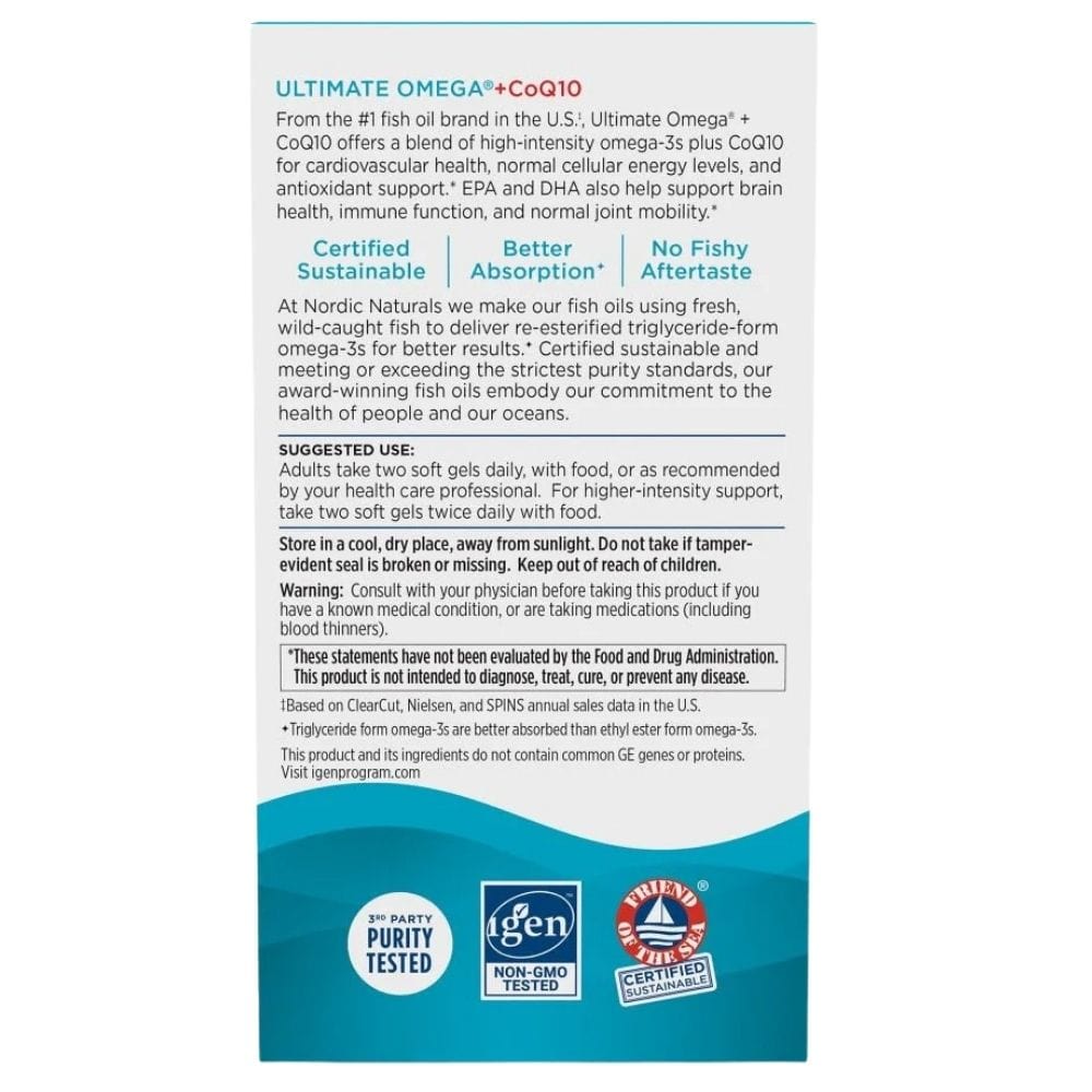 Nordic Naturals Ultimate Omega + Coq10 ist ein Nahrungsergänzungsmittel in Gelkapseln. Es enthält hochkonzentrierte Omega-3-Fettsäuren mit zugesetztem Coenzym Q10.