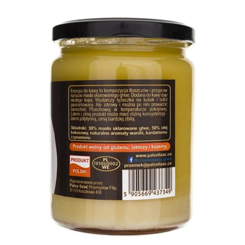 80% geklärte Ghee-Butter, Kokosnussöl, natürliche Aromen von Vanilla, Kardamom und Zimt.