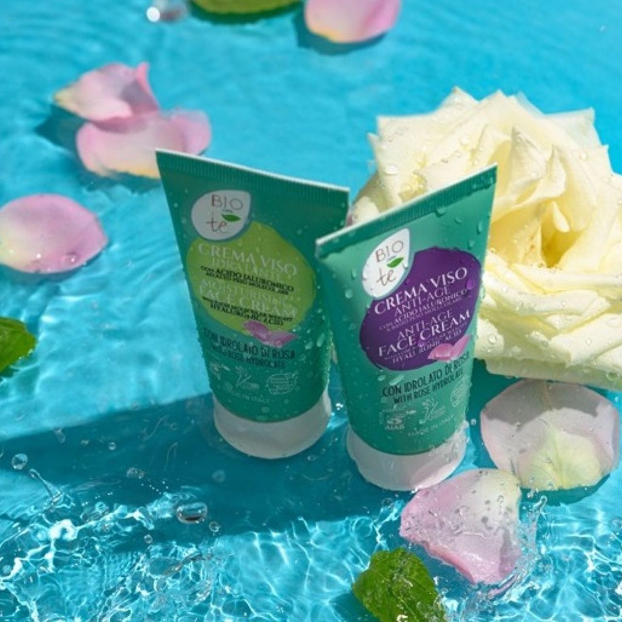 Anti-Aging-Gesichtscreme mit Bio-Rosenhydrolat und niedermolekularer Hyaluronsäure . Die Formel auf Basis von Bio-Hydrolaten spendet der Haut intensive Feuchtigkeit und regeneriert sie . Die Creme reduziert effektiv das Erscheinungsbild von Falten , verbessert die Elastizität und glättet die Haut.