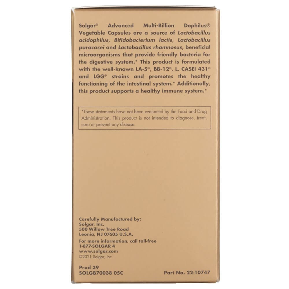 Solgar® Advanced Multi-Billion Dophilus® Gemüsekapseln sind eine Quelle von Lactobacillus acidophilus, Bifidobacterium lactis, Lactobacillus paracasei und Lactobacillus rhamnosus, nützliche Mikroorganismen, die freundliche Bakterien für das Verdauungssystem bieten. Dieses Produkt ist mit den bekannten Stämmen LA-5®, BB-12®, L. CASEI 431® und LGG® formuliert und fördert die gesunde Funktion des Darmsystems. Zusätzlich unterstützt dieses Produkt ein gesundes Immunsystem.