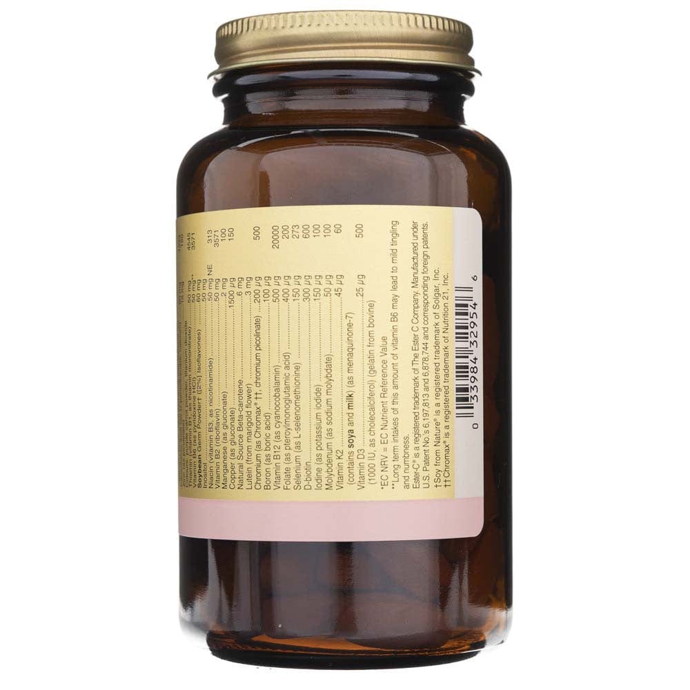 Calcium (Citrat, Ascorbat), Füllstoffe: Mikrokristalline Cellulose, Dicalciumphosphat, Alginat, Erbsenstärke, Dextrin, Hydroxypropylcellulose, modifizierte Lebensmittelstärke, Magnesium (als Citrat, Oxid), Vitamin C (als Ester-C, Calciumascorbat), Vitamin E (als D-Alpha-Tocopherylsäuresuccinat), Citrus-Bioflavonoid-Komplex, Trennmittel: pflanzliche Stearinsäure, Siliciumdioxid, pflanzliches Magnesiumstearat, Cellulosegummi, Cholin (als Diquinat), Überzugsmittel: Hydroxypropylmethylcellulose, pflanzliches Glycerin (aus Palmkernöl und Kokosöl), Pantothensäure (als D-Pantothenat, Calcium), Zink (als Picolinat), Farbstoffe: Lila Karottenpulver, Titandioxid, Thiamin (Vitamin B1 als Thiaminmononitrat), Vitamin B6 (als Pyridoxinhydrochlorid), Sojakeimpulver ([2%] Isoflavone), Inositol Niacin (Vitamin B3, als Nicotinamid), Vitamin B2 (Riboflavin), Mangan (als Gluconat), Kupfer (als Gluconat), natürliche Beta-Carotinquelle, Lutein (aus Ringelblumenblüten), Chrom (als Chromax, Chrompicolinat), Bor (als Borsäure), Vitamin B12 (als Cyanocobalamin), Folsäure (als Pteroylmonoglutaminsäure), Selen (als L-Selenomethionin), D-Biotin, Jod (als Kaliumiodid), Molybdän (als Natriummolybdat), Vitamin K2 (enthält Soja und Milch) (als Menachinon-7), Vitamin D3 (als Cholecalciferol) (Rindergelatine).