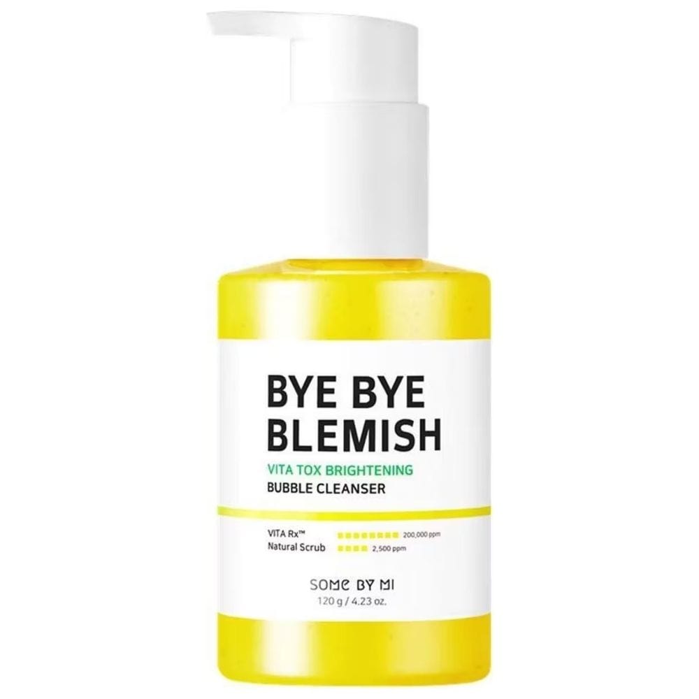 Some By Mi Bye Bye Blemish Vita Tox Brightening Bubble Cleanser ist ein innovativer Reinigungsschaum mit einem Komplex aus 18 Vitaminen. Die Formel mit Wasserstoffbläschen reinigt und hellt die Haut sanft auf , reduziert Verfärbungen und verleiht ihr einen gesunden Glanz.