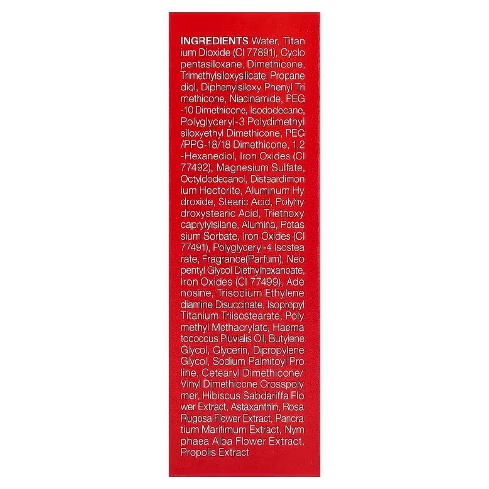 Wasser, Titandioxid (CI 77891), Cyclopentasiloxan, Dimethicon, Trimethylsiloxysilicat, Propandiol, Diphenylsiloxyphenyltrimethicon, Niacinamid, PEG-10-Dimethicon, Isododecan, Polyglyceryl-3-Polydimethylsiloxyethyldimethicon, PEG/PPG-18/18-Dimethicon, 1,2-Hexandiol, Eisenoxide (CI 77492), Magnesiumsulfat, Octyldodecanol, Disteardimoniumhectorit, Aluminiumhydroxid, Stearinsäure, Polyhydroxystearinsäure, Triethoxycaprylylsilan, Aluminiumoxid, Kaliumsorbat, Eisenoxide (CI 77491), Polyglyceryl-4-Isostearat, Duftstoff (Parfum), Neopentylglykoldiethylhexanoat, Eisenoxide (CI 77499), Adenosin, Trinatriumethylen Diamindisuccinat, Isopropyltitantriisostearat, Polymethylmethacrylat, Haematococcus pluvialis-Öl, Butylenglykol, Glycerin, Dipropylenglykol, Natriumpalmitoylprolin, Cetearyldimethicon/Vinyldimethicon-Crosspolymer, Hibiscus-sabdariffa-Blütenextrakt, Astaxanthin, Rosa-rugosa-Blütenextrakt, Pancratium-maritimum-Extrakt, Nymphaea-alba-Blütenextrakt, Propolis-Extrakt.