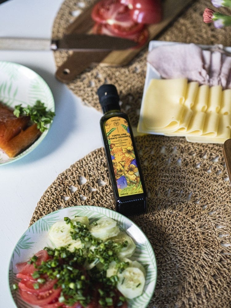 Goldenes Leinöl (auch bekannt als Budwig-Öl ) ist ein kaltgepresstes Produkt aus sorgfältig ausgewählten goldenen Leinsamen. Das Produkt ist vollkommen natürlich, frei von unnötigen chemischen Zusätzen und wird nach traditioneller Methode gepresst, wodurch die Nährstoffe und der hervorragende Geschmack der Samen, aus denen es hergestellt wurde, erhalten bleiben. Goldenes Leinöl unterscheidet sich von braunem Leinöl hauptsächlich durch seine hellere Farbe und seinen feineren, verfeinerten Geschmack . Ihre Eigenschaften sind jedoch ähnlich und gleichermaßen gesundheitsfördernd.